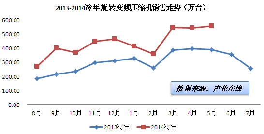 產(chǎn)業(yè)在線訊:根據(jù)產(chǎn)業(yè)在線數(shù)據(jù)統(tǒng)計顯示,2014年5月,旋轉(zhuǎn)變頻壓縮機銷售557萬臺,同比增長43%。截至5月,旋轉(zhuǎn)變頻壓縮機銷售4373萬臺,同比增長46%,預(yù)計冷年結(jié)束,銷量接近或超過5千萬臺。綜合2014冷年變頻表現(xiàn),可以說變頻產(chǎn)品一路高歌。
